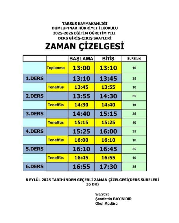 Okulumuz 2025-2026 Eğitim-Öğretim yılı Giriş-Çıkış Saatleri